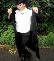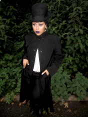 Fortuitous, I was successful in snagging a true vintage bowler hat two years ago. The material is a black wool as the hat base and the brim are in great condition! In replacement of not having a black scarf, I cut up an old thin t-shirt using it underneath to hold back my braids leaving a more sleek appearance.