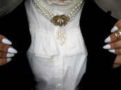 I specifically wore a white ruffled top in representation of the Victorian era. The precious addition to styling this look was to embody this rare vintage lion necklace, inclusive of different size pearls wrapped all across as some lingering down from the lions mouth.
