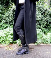 My trousers have a regular waist, concealed zipper, slim legs with ankle-length including slit hems and stretch fabric leaving you with enough room to wiggle. The vintage single breasted button down trench coat is primitive. It has rain protective fabric, popped with faded olive brownish shade peeking out the inter collar and side pockets.