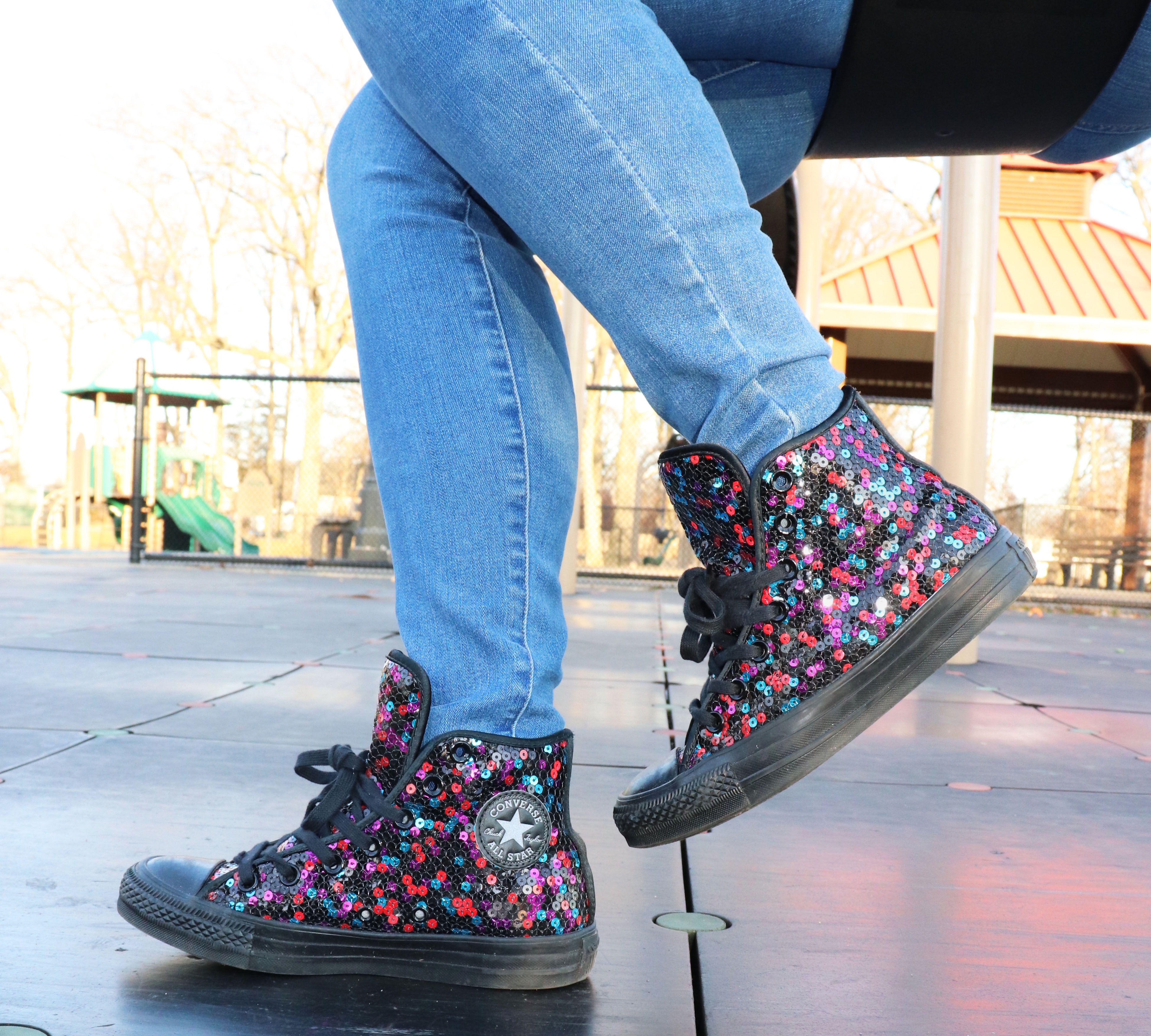 I wore light weight beige thermal underneath, standard blue jeans adjacent to Converse Chuck Taylor multi-colored sequin sneakers with upper a reflective patch and a cushioned insole. Kept the jewelry light wearing only my gold hoop earrings, cat eyeliner, mauve nude lipstick from MAC Cosmetics (I can’t remember the shade) zing green eyeshadow from Jane Cosmestics in the inner tear dot for that pop of radiance & highlight.  Closing out the outfit, I clinched a large pin across the collar to keep that up-right effect w/out having to “pop my collar” consistently – worked like a charm!
