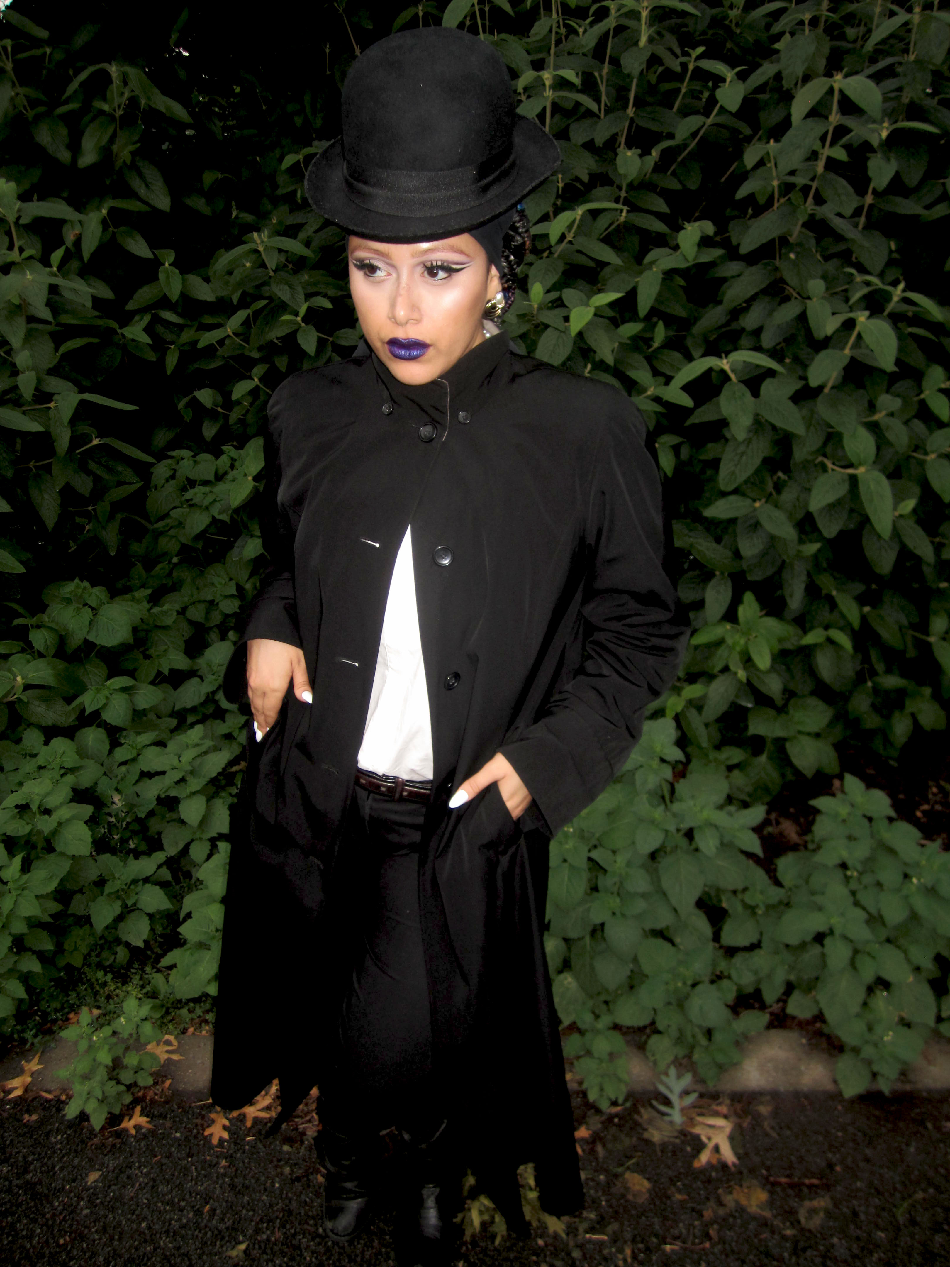 Fortuitous, I was successful in snagging a true vintage bowler hat two years ago. The material is a black wool as the hat base and the brim are in great condition! In replacement of not having a black scarf, I cut up an old thin t-shirt using it underneath to hold back my braids leaving a more sleek appearance.