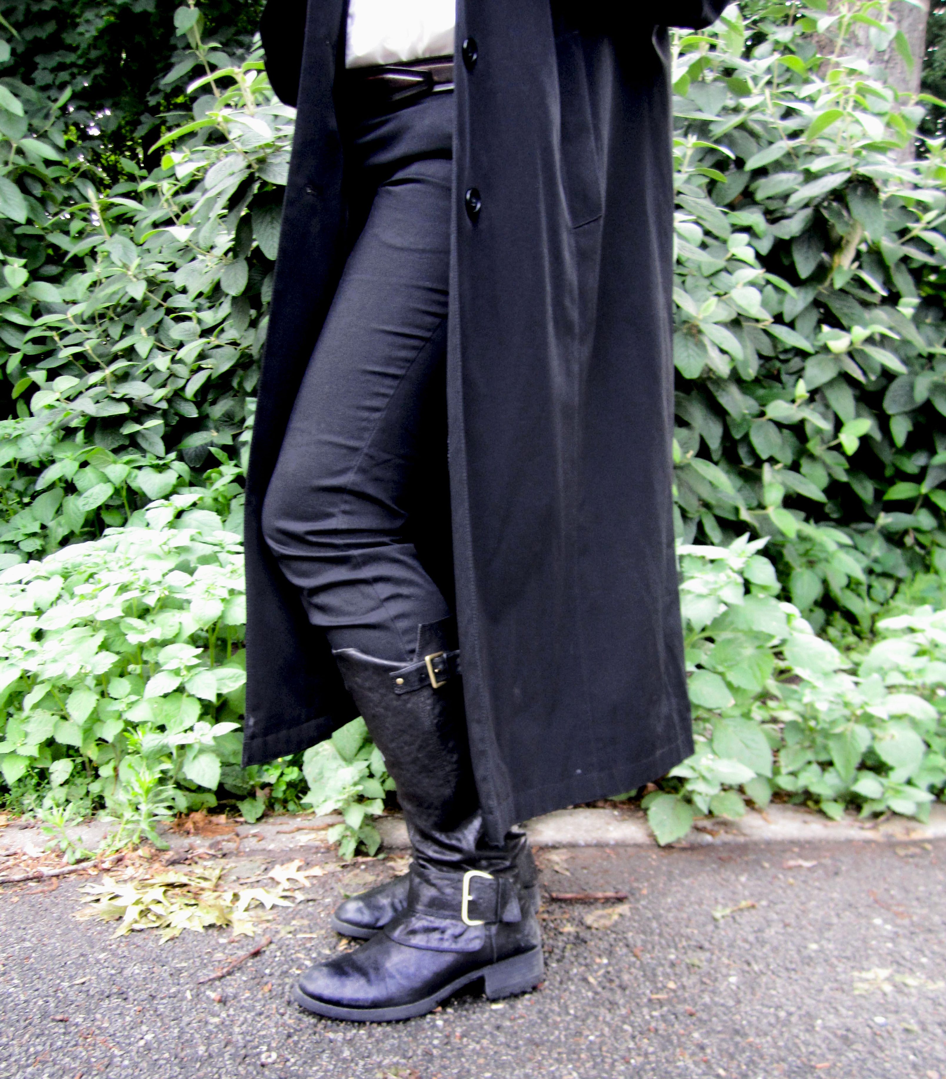 My trousers have a regular waist, concealed zipper, slim legs with ankle-length including slit hems and stretch fabric leaving you with enough room to wiggle. The vintage single breasted button down trench coat is primitive. It has rain protective fabric, popped with faded olive brownish shade peeking out the inter collar and side pockets.