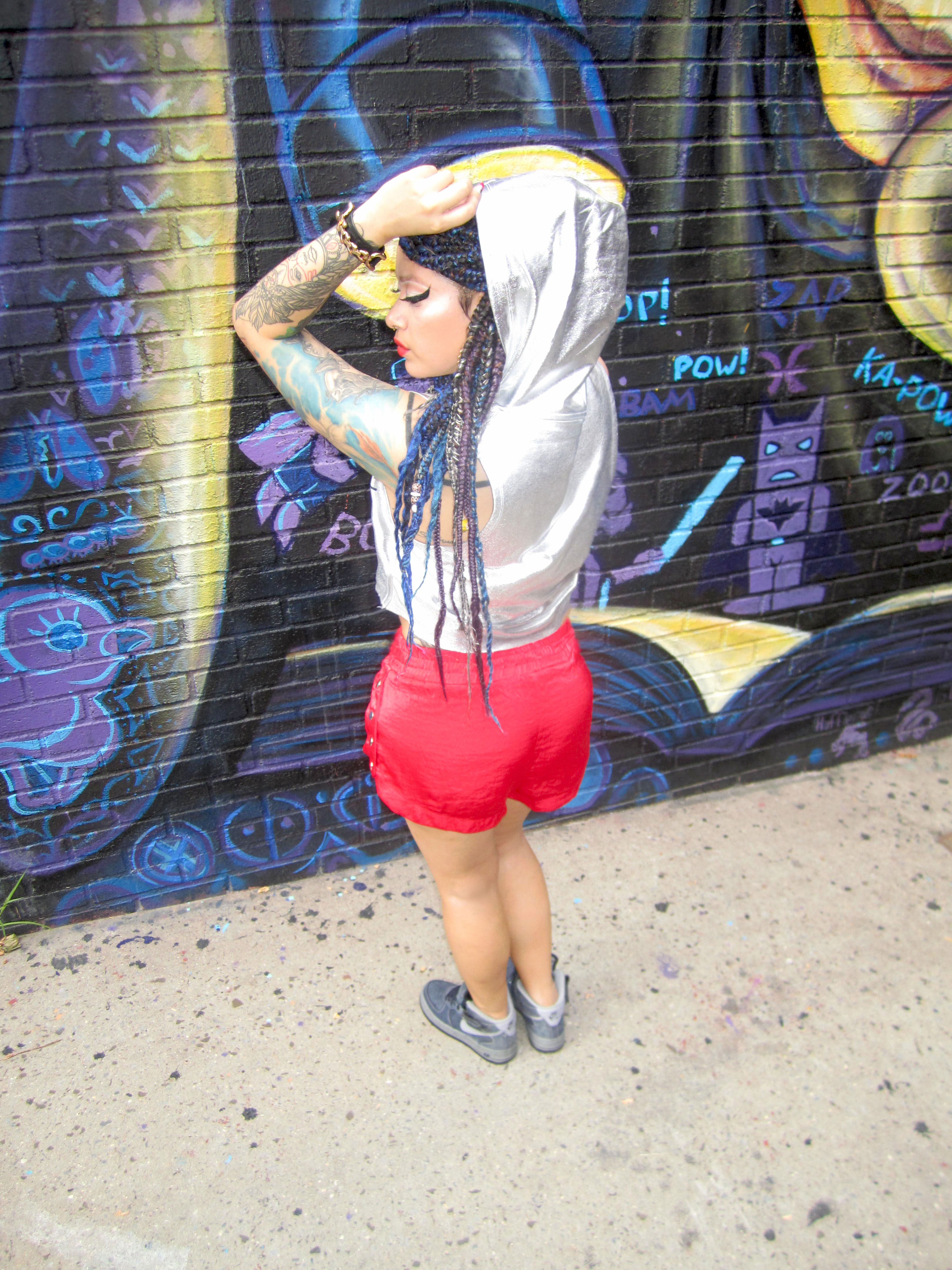 I was bit indecisive going with the whole traditional red, white and blue representation scheme for an outfit on the 4th of July. I was invited to a rooftop party that subsume live music, food and fireworks you can see sky rocket up from the city skyline so I was positive I wanted to sport something flashy or categorical to that. Browsing through my dresser for options, I reached for a sleeveless hoodie I purchased during the spring and yet to wear. Mainly because of the ostentatious shine (wearing anything metallic) I said “….fuck it, I’ll just add red and blue but my way.”